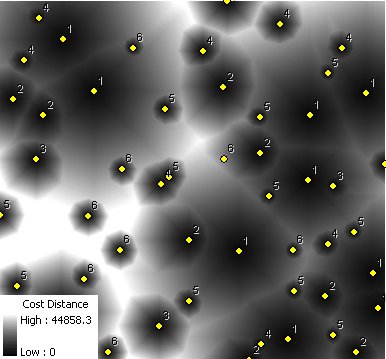 Calculates for each cell of the output raster the least cost to reach one of the sources of the input point feature class. The cost is calculated as distance from the cell to the source multiplied by the weight of the source. The smaller the weight value of a source is, the greater the influence of the source is.