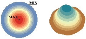 The surface has maximum value in the input point, decreases as the distance from the input point increases and has 0 values at distance