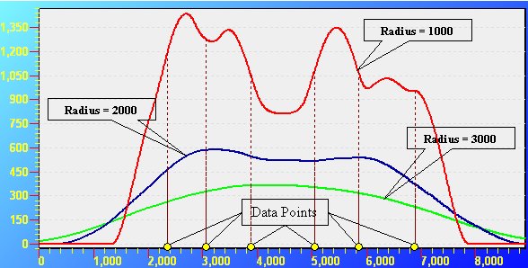 Uses Kernel Density Estimation to interpolate a surface from the input Point or Polyline features. The function fits a symmetrical surface over each input point using Gaussian kernel.