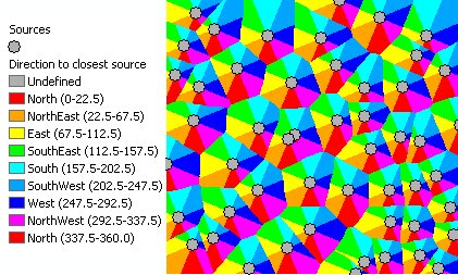 Calculates for each cell of the output raster the direction to the closest point (source) of the input feature class. If the input feature class is of Polyline or Polygon type, the vertices will be used as sources..