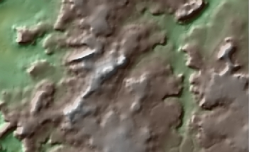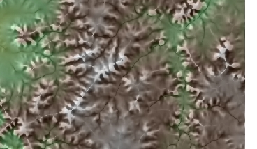 DEM (50% transparency) over Plan Curvature (20% transparency) over hillshade. Pronounced valleys and ridges.