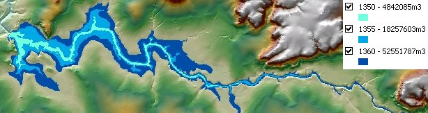 Volume for a dam calculated for three different levels - 1350, 1355 and 1360 meters. The option to calculate the volume only below the reference plane used. The result rasters converted to polygons. The polygons downstream from the dam wall removed.