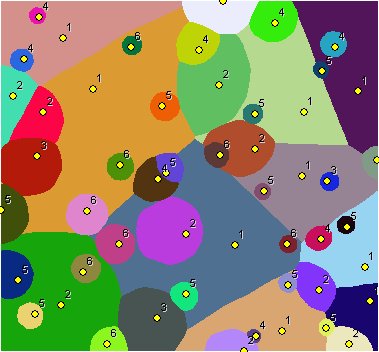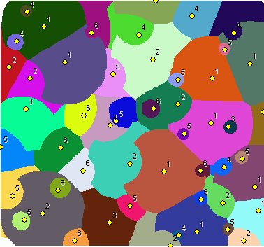 All sources start growing at the same time. A source with weight = 1 increases its area every cycle, a source with weight = 2 every second cycle, a source with weight = 10 every tenth cycle and so on. The process finishes when all cells of the output raster are occupied. If cutoff distance is specified a source will stop increasing its area when it reaches the maximum radius of influence.