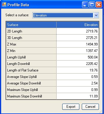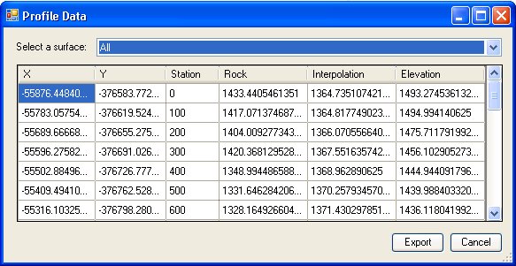 The user needs to select a surface for which the data will be exported. If the user selects "All", then the data for all surfaces in the Profile Window will be exported. Since profiles of different types may have different data points, the data points are merged and sorted, and Z values for each surface calculated for the resultant list of data points.