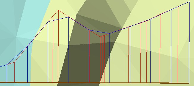 The image above shows 2 profiles extracted from a TIN surface for the same cross-section line. The profile in red is extracted without using sample distance. The data points are extracted for the significant points of the TIN (intersections with the edges of triangles). The profile in blue is extracted using sample distance. One can see that some significant points (peaks and valleys) are missing from the blue profile.